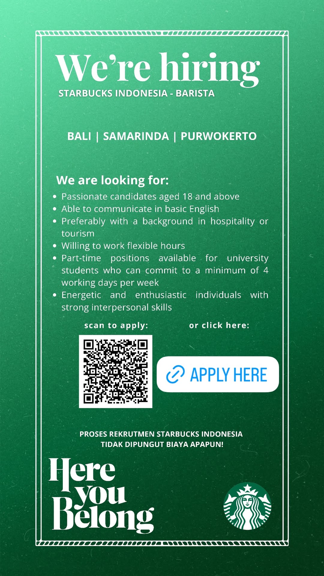 Saat ini, PT Sari Coffee Indonesia (Starbucks Indonesia) sedang membuka kesempatan berkarir dengan posisi sebagai berikut :