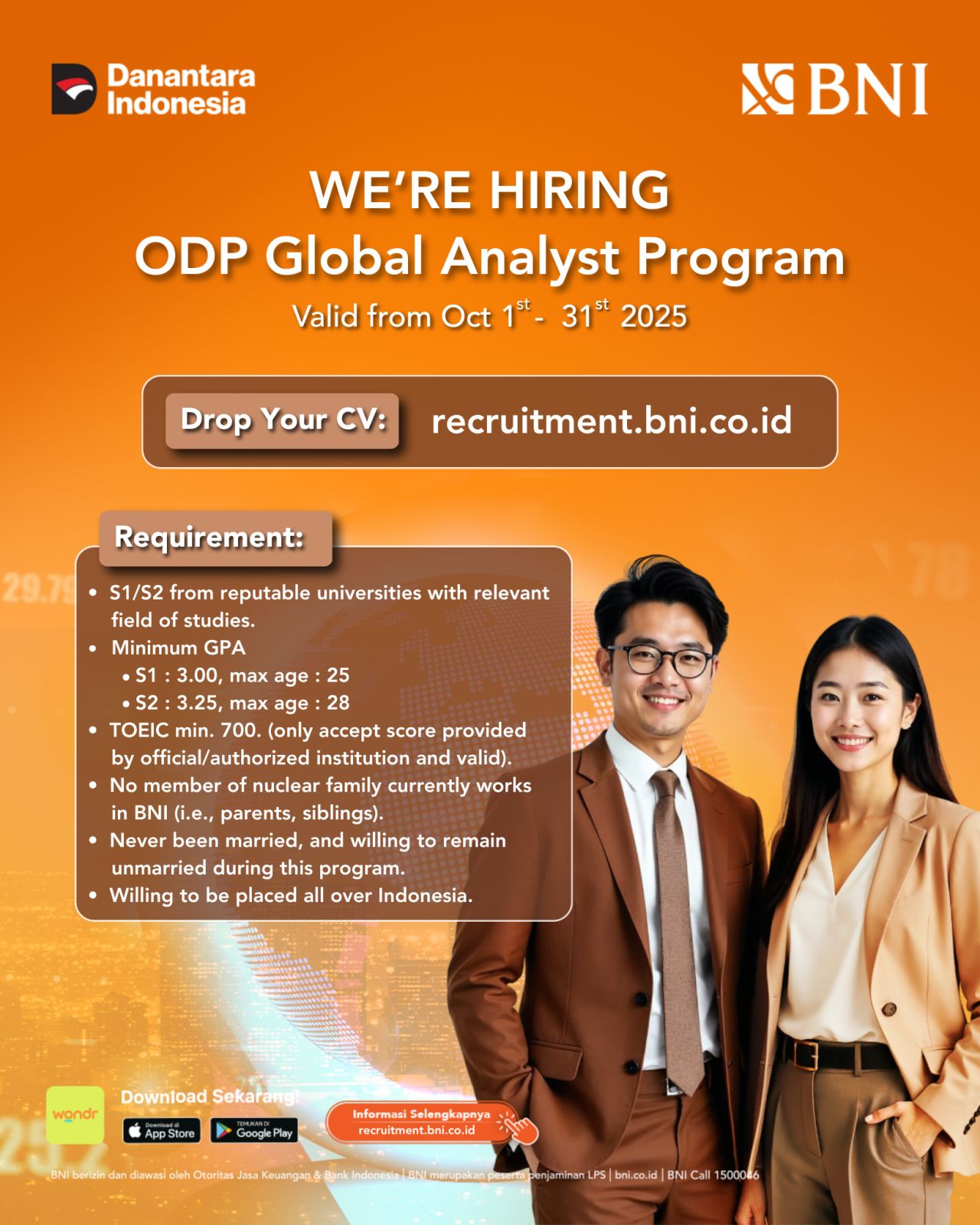 - To support our vision, BNI is committed to attract high-quality talents across the country to ensure our further accomplishments. You will be immersed an exceptional and challenging work environment and surrounded by colleagues and leaders who are passionate to help you grow and development your skill.