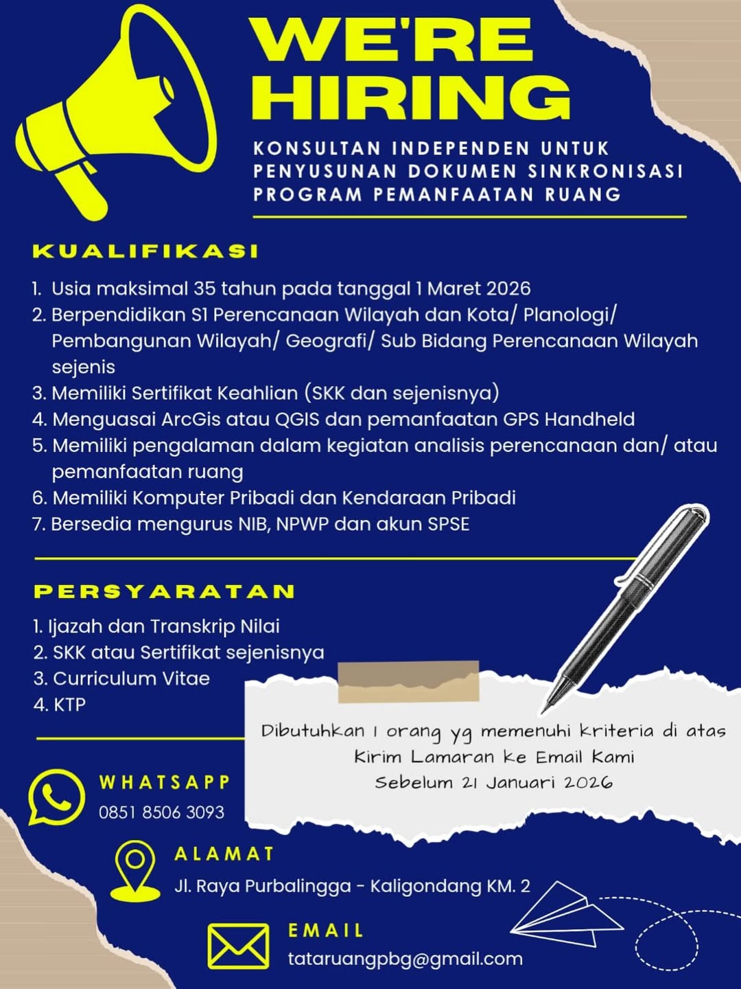 - Berpendidikan S1 Perencanaan Wilayah dan Kota/Planologi/Pembangunan Wilayah/Geografi/Sub Bidang Perencanaan Wilayah sejenis